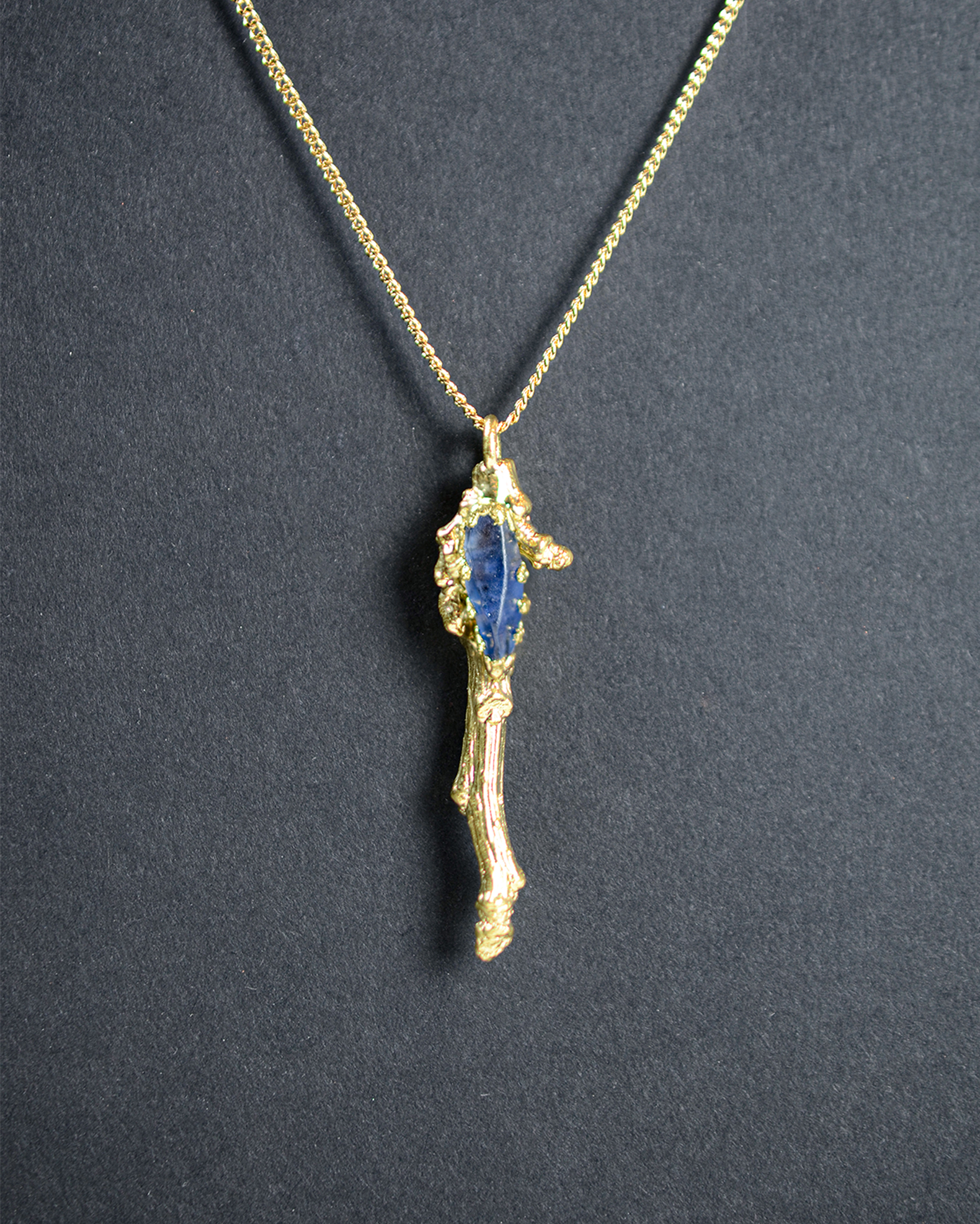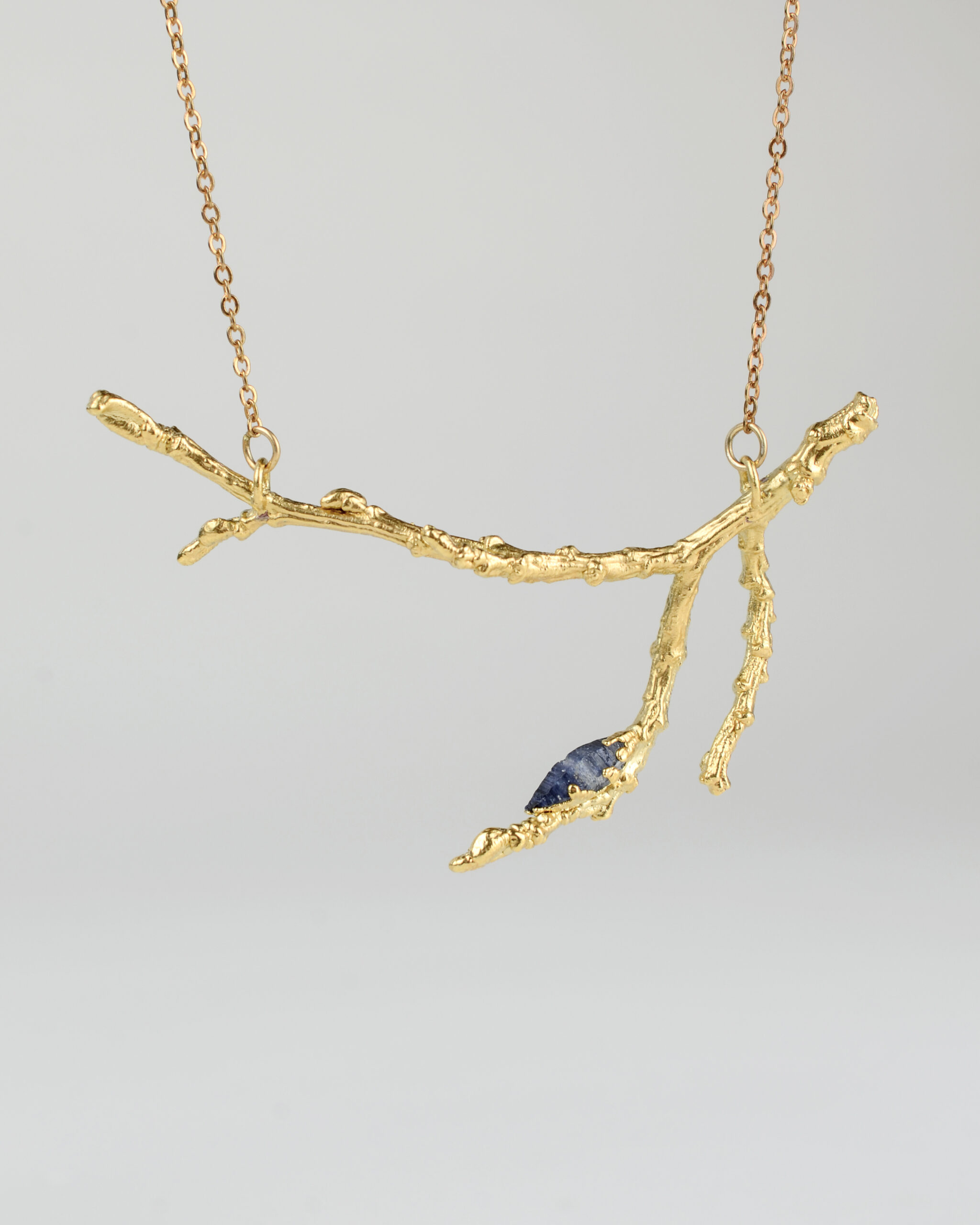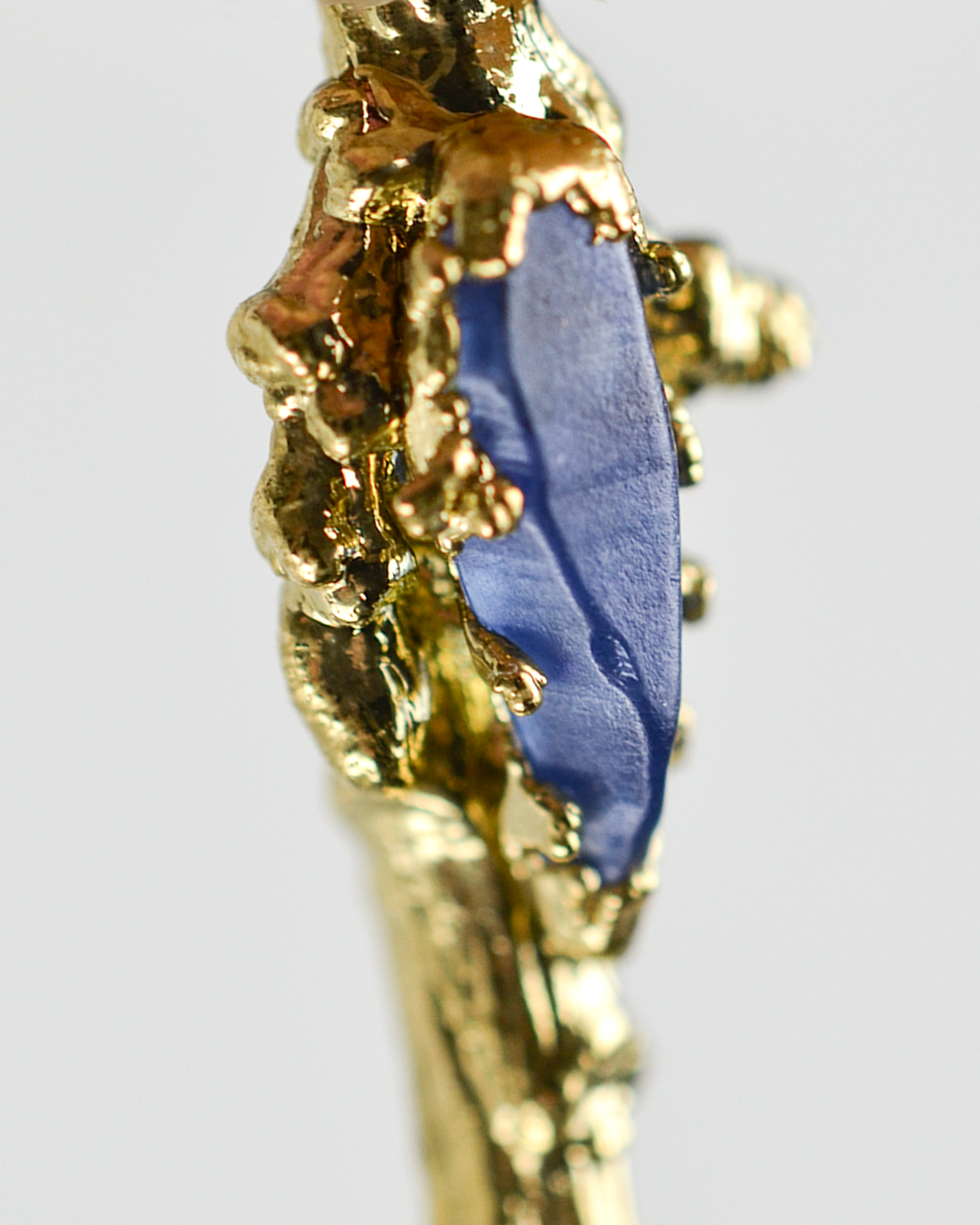 Electrodéposition de cuivre et or sur branche, sertissant un saphir brut de Ceylan.